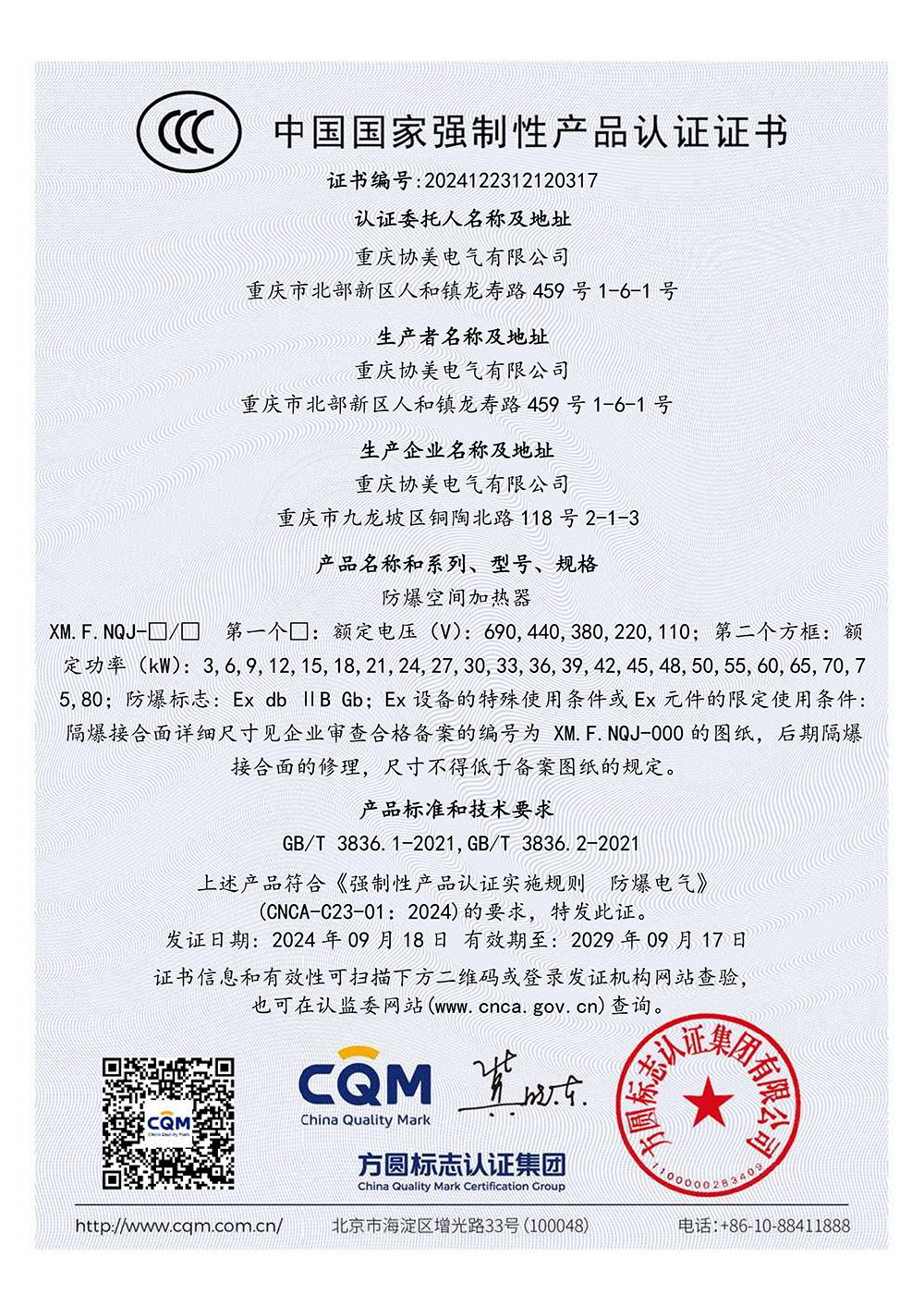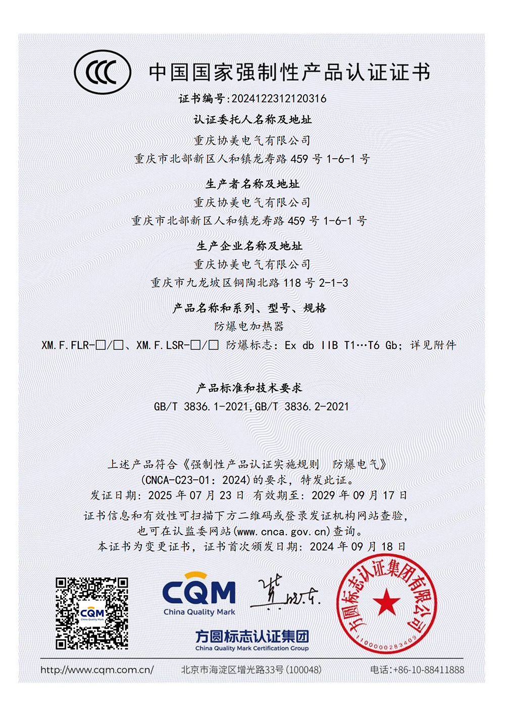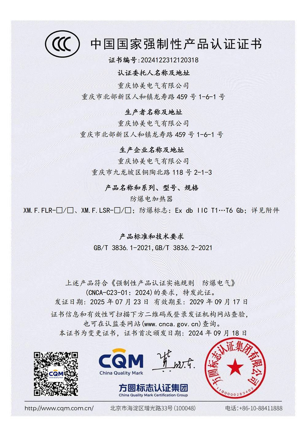 防爆电加热器CCC证书(dII C)