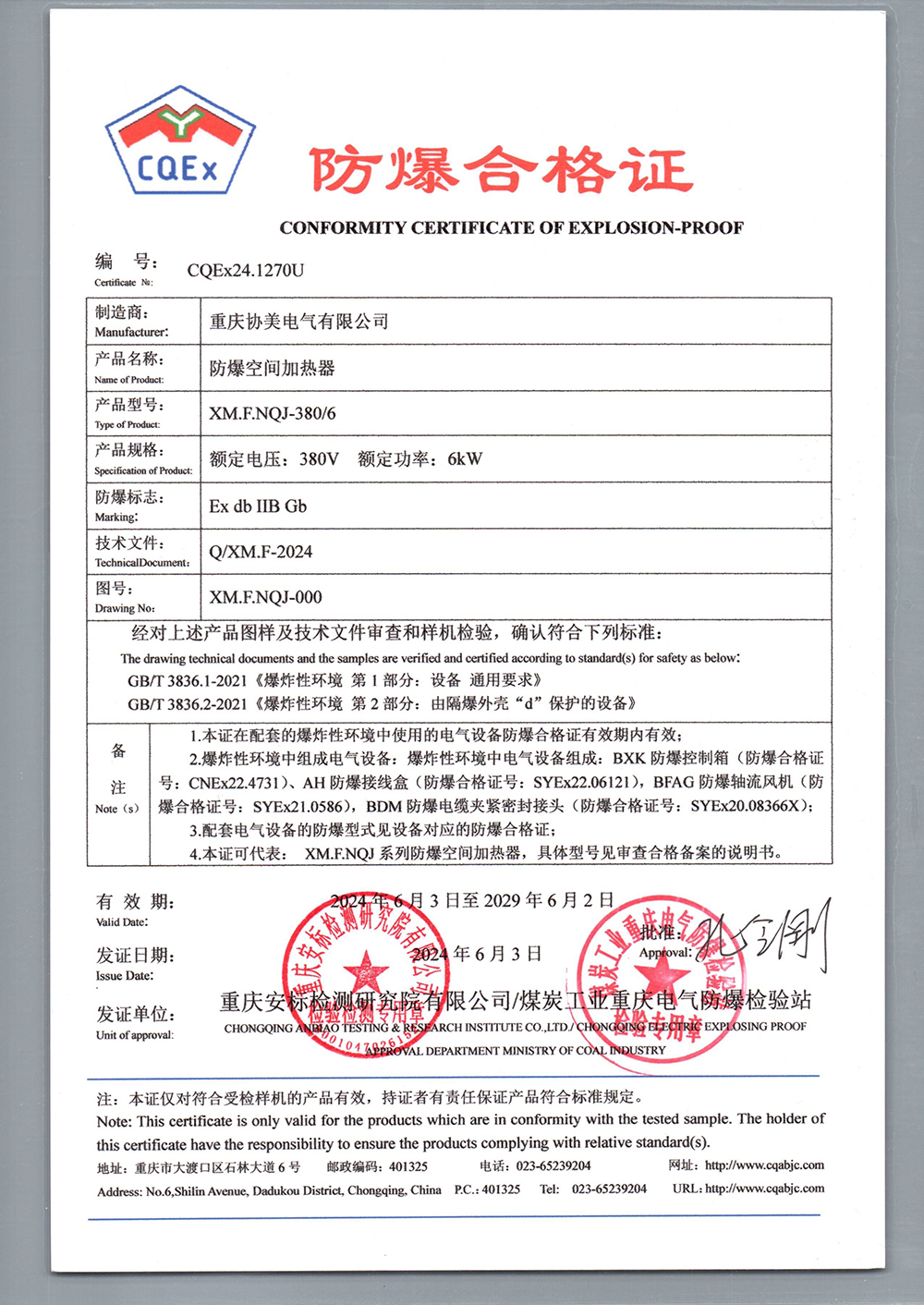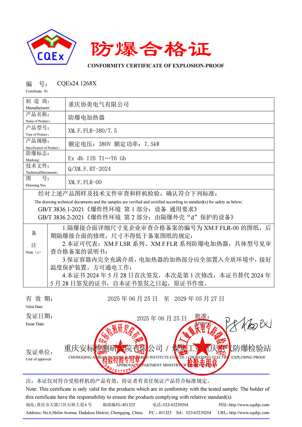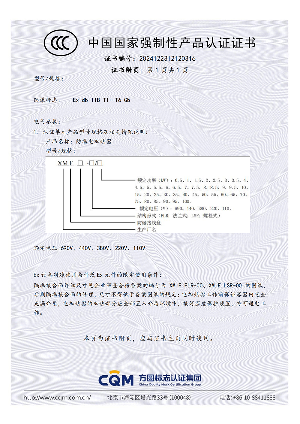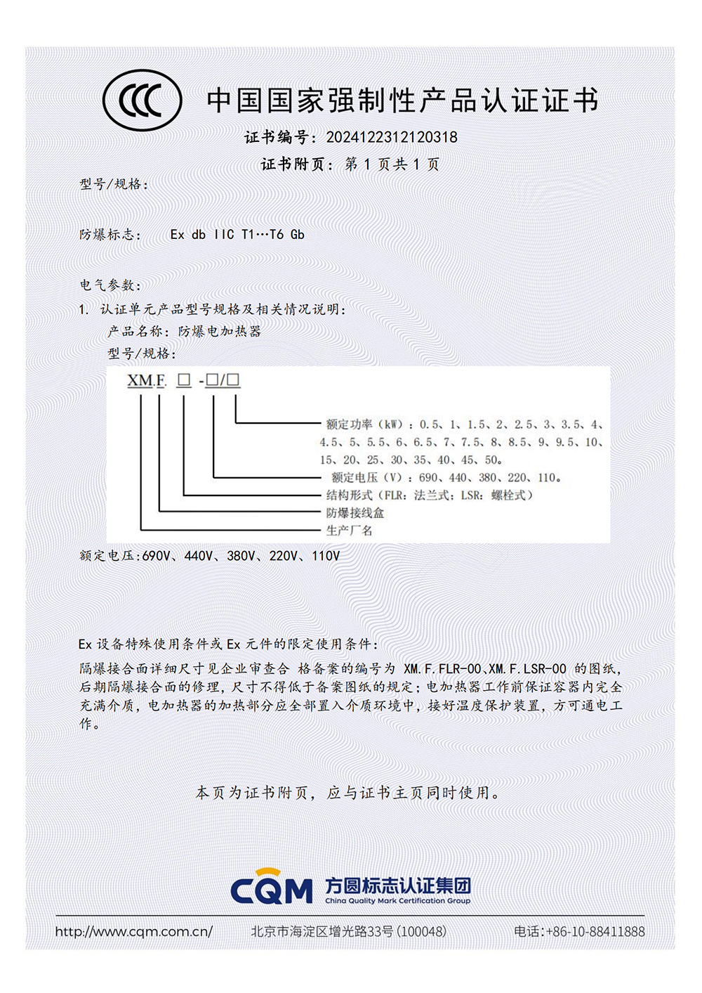 防爆电加热器CCC证书(dII C)【附页】